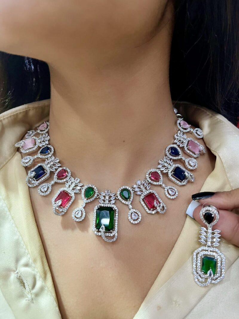 An elegant American Diamond necklace set with intricate detailing and graceful drop design, perfect for weddings, parties, and festive occasions.