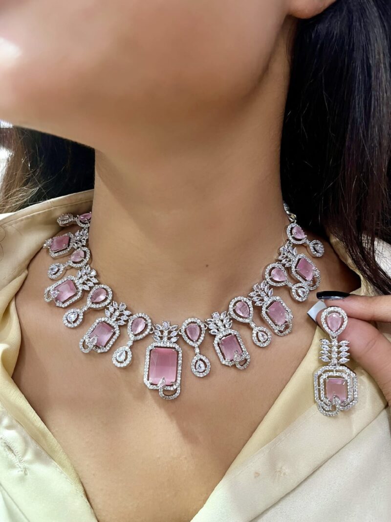 An elegant American Diamond necklace set with intricate detailing and graceful drop design, perfect for weddings, parties, and festive occasions.