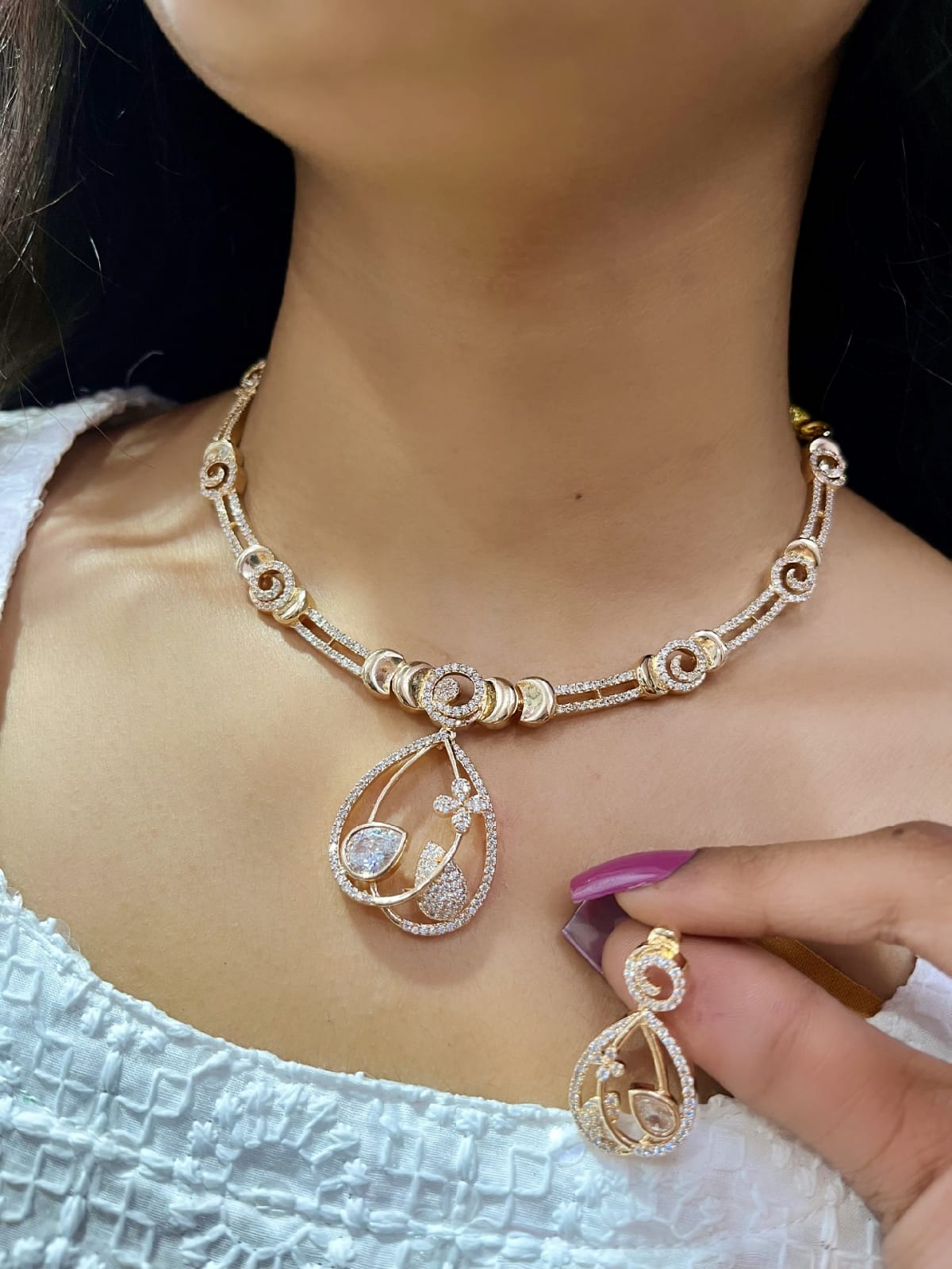 An elegant American Diamond necklace set with intricate detailing and graceful drop design, perfect for weddings, parties, and festive occasions.