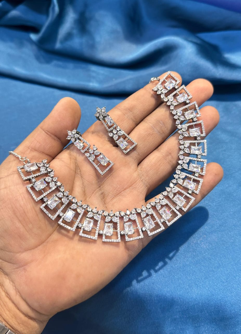 Stunning American diamond necklace set enhanced with striking teardrop stones, crafted for a radiant and glamorous look.