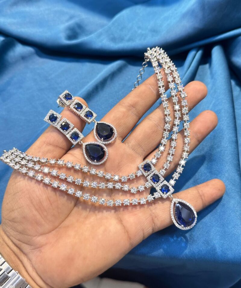 Stunning American diamond necklace set enhanced with striking teardrop stones, crafted for a radiant and glamorous look.