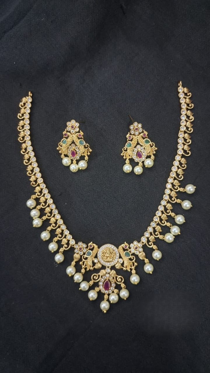 Elegant AD Kundan Temple necklace set designed with fine craftsmanship, giving a regal and timeless appeal for any ethnic outfit.