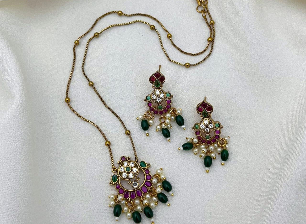 A stunning premium AD necklace set featuring a double-layered design with a bold centre pendant and matching earrings. The soft pastel accent adds an elegant touch, perfect for parties, receptions, and special occasions.