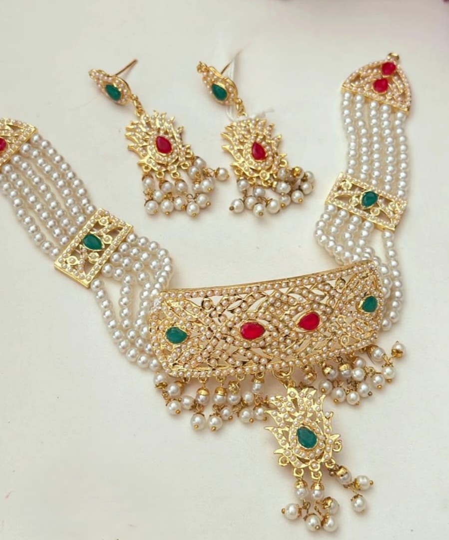 A stunning multi-layer choker set beautifully designed with pearls, blue beads, and a statement Kundan centerpiece. Paired with matching Kundan earrings, this set blends traditional elegance with a modern touch, perfect for festive and special occasions.
