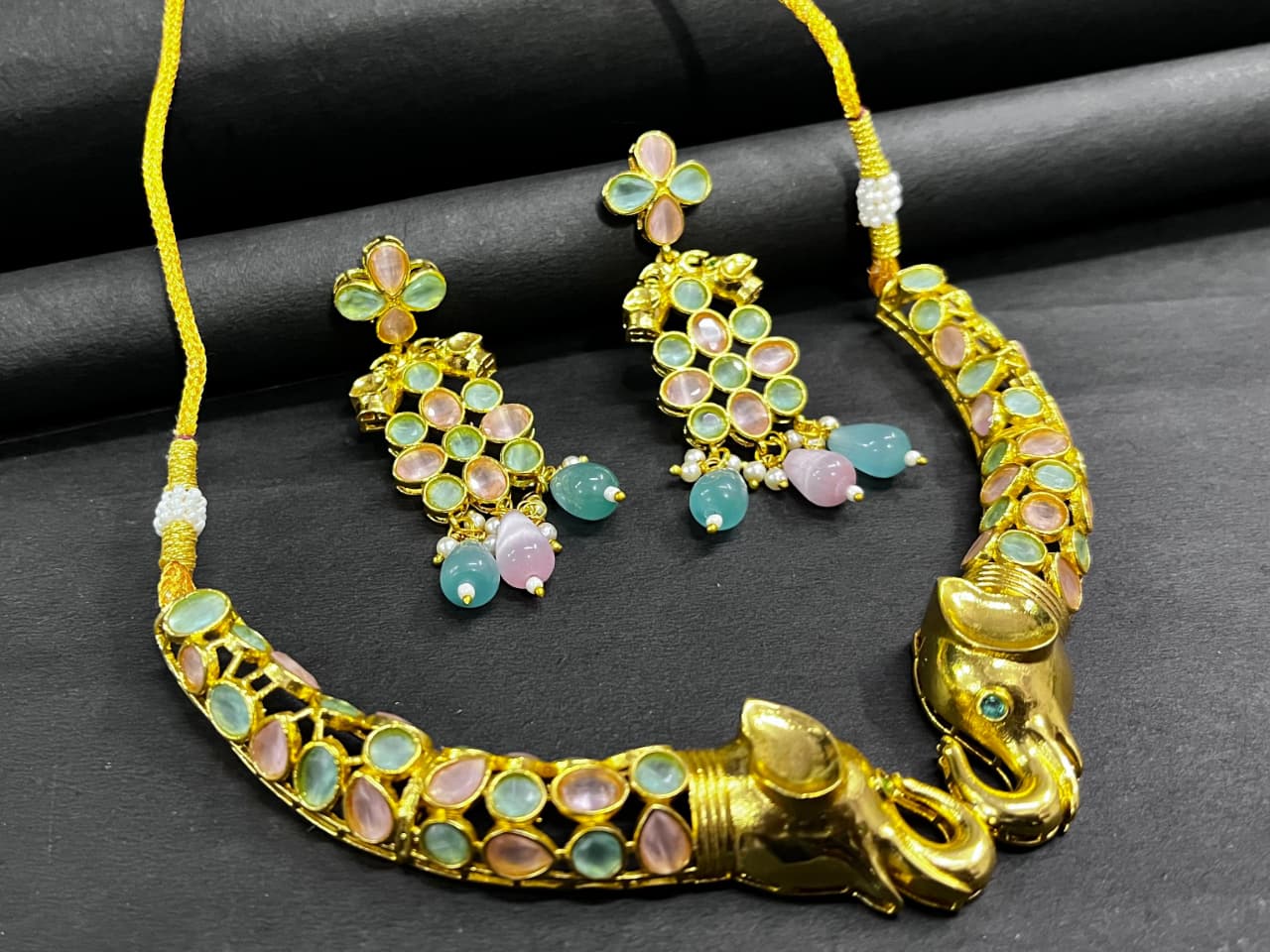 A striking Rajwadi Kundan Necklace Set crafted with intricate elephant motifs, highlighted by vibrant kundan stones and delicate pearl accents. Paired with matching drop earrings, this regal set adds a bold traditional charm and royal elegance to festive and wedding looks.
