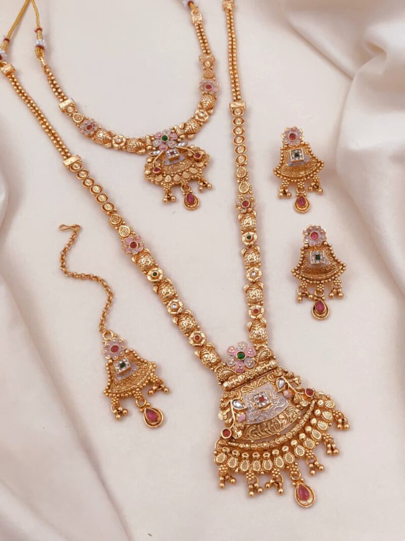 A graceful pair of Rajwadi necklaces showcasing intricate traditional motifs and a rich antique finish—perfect to elevate festive and bridal looks with timeless royal charm.