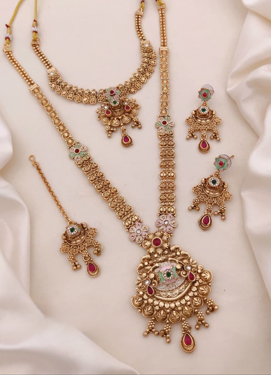 A graceful pair of Rajwadi necklaces showcasing intricate traditional motifs and a rich antique finish—perfect to elevate festive and bridal looks with timeless royal charm.