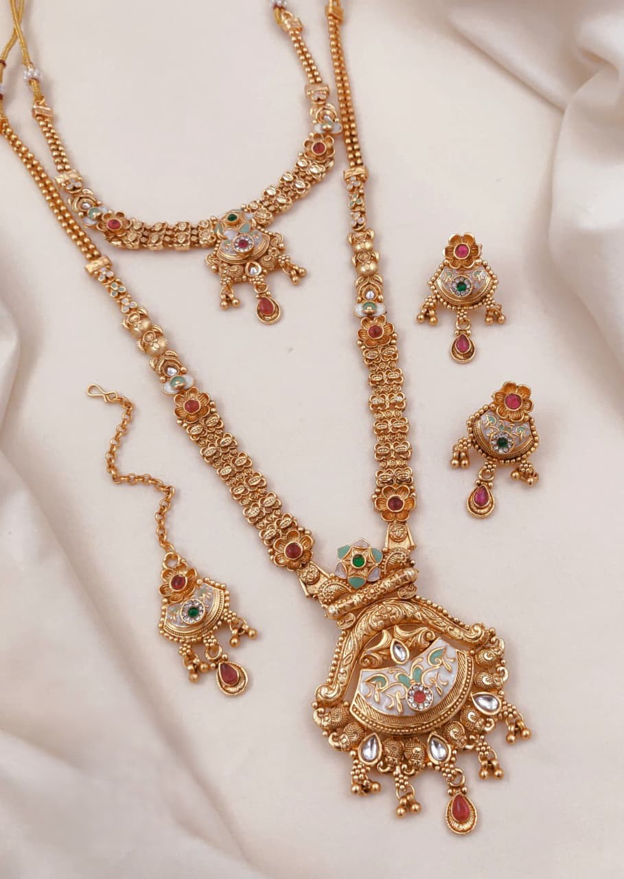 A graceful pair of Rajwadi necklaces showcasing intricate traditional motifs and a rich antique finish—perfect to elevate festive and bridal looks with timeless royal charm.