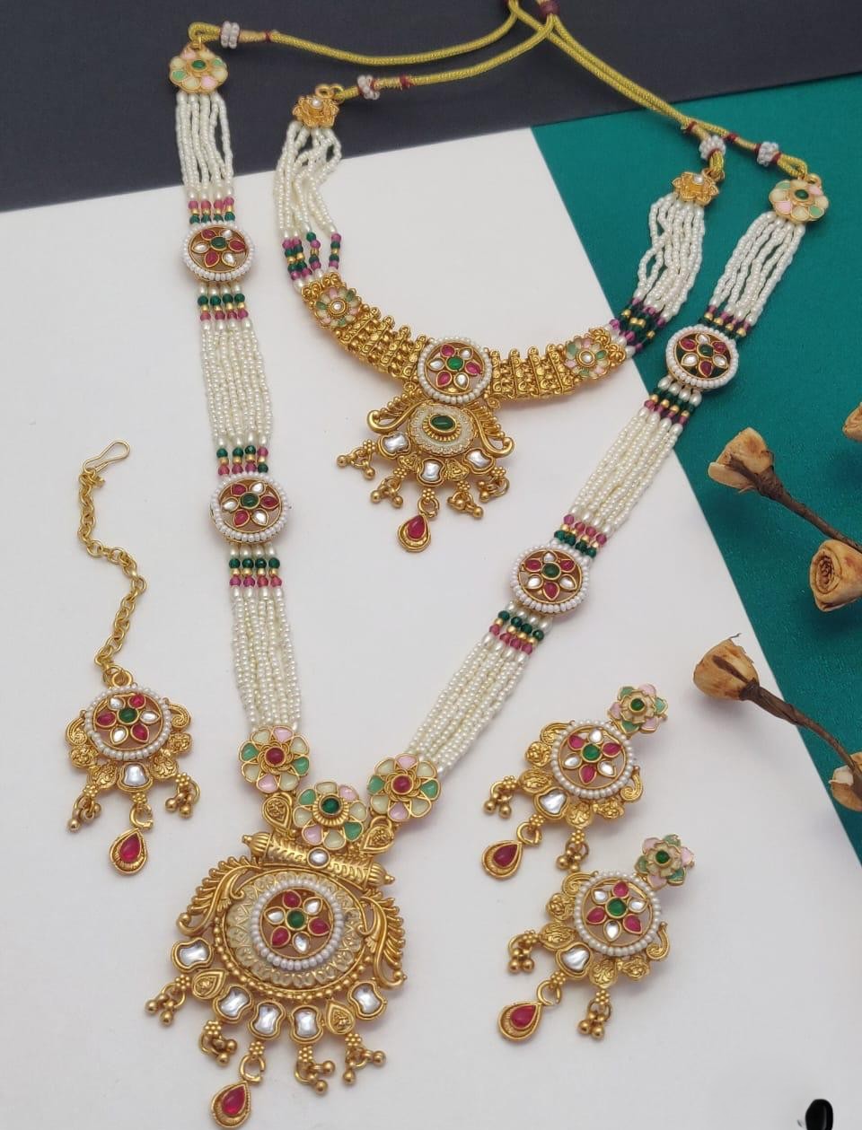 A graceful Rajwadi-style jewellery set adorned with pearls, colourful stones, and antique gold detailing—perfect for weddings and celebrations.