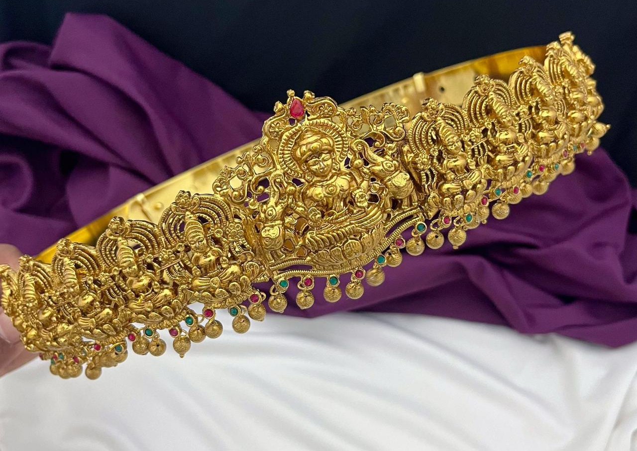 Adorn yourself with timeless grace with this exquisite Temple Jewellery Hip Belt, crafted to celebrate the divine beauty of tradition. Designed with intricate carvings inspired by South Indian temple architecture, the piece features delicate motifs of Lakshmi, peacocks, and lotus blooms—symbols of prosperity and purity.
