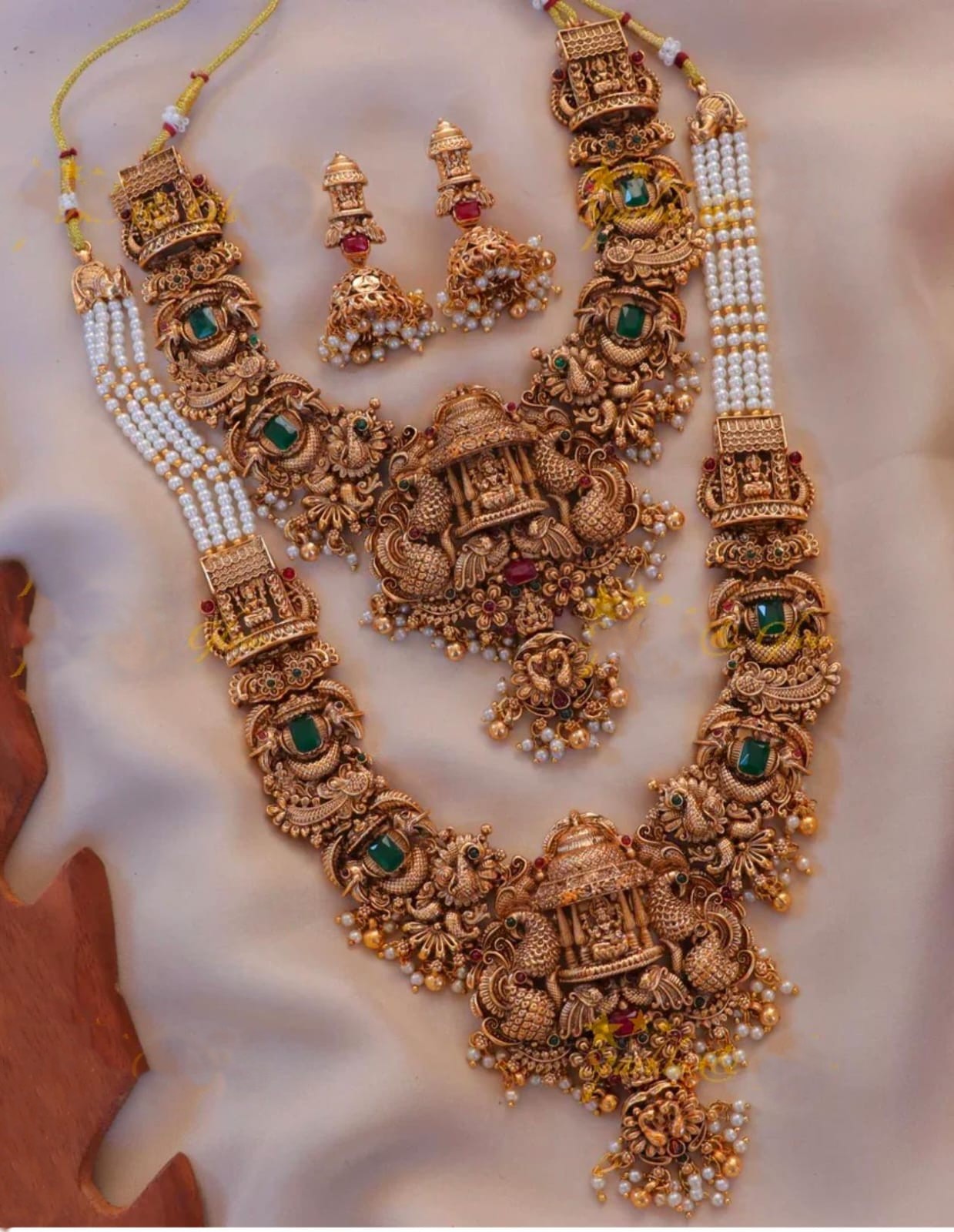 A grand traditional necklace set with intricate craftsmanship, rich detailing, and layered bead accents, perfect for weddings and festive occasions.