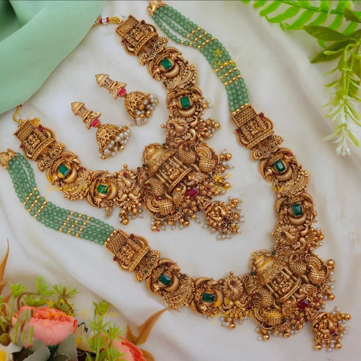 A grand traditional necklace set with intricate craftsmanship, rich detailing, and layered bead accents, perfect for weddings and festive occasions.