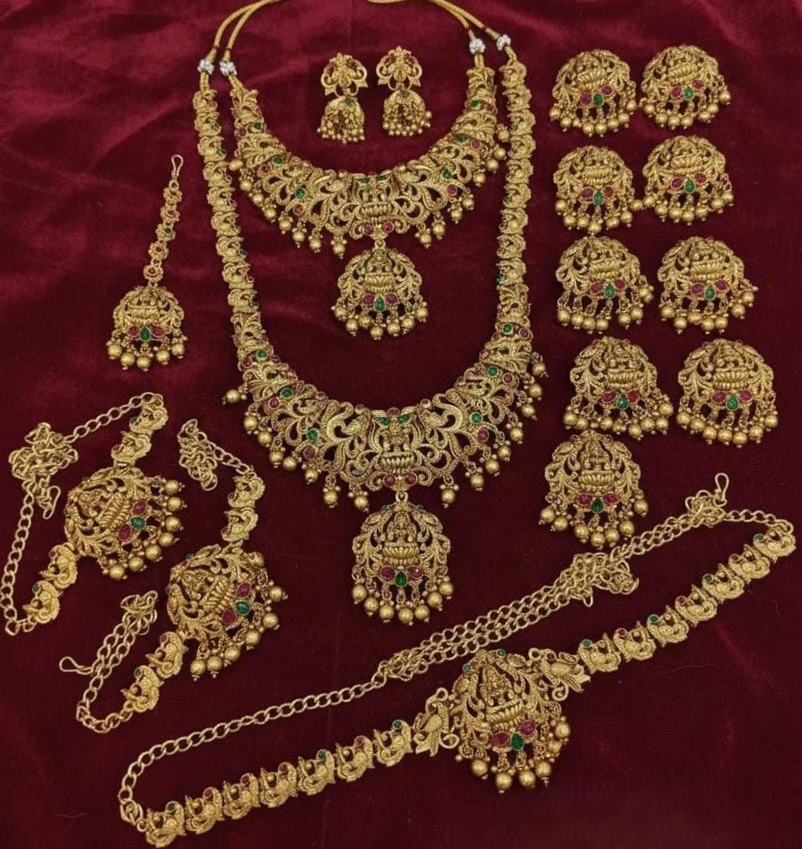 A beautifully crafted traditional antique jewellery set with rich detailing and classic danglers. Designed with intricate patterns and a grand finish, it adds a royal touch to bridal and festive looks.