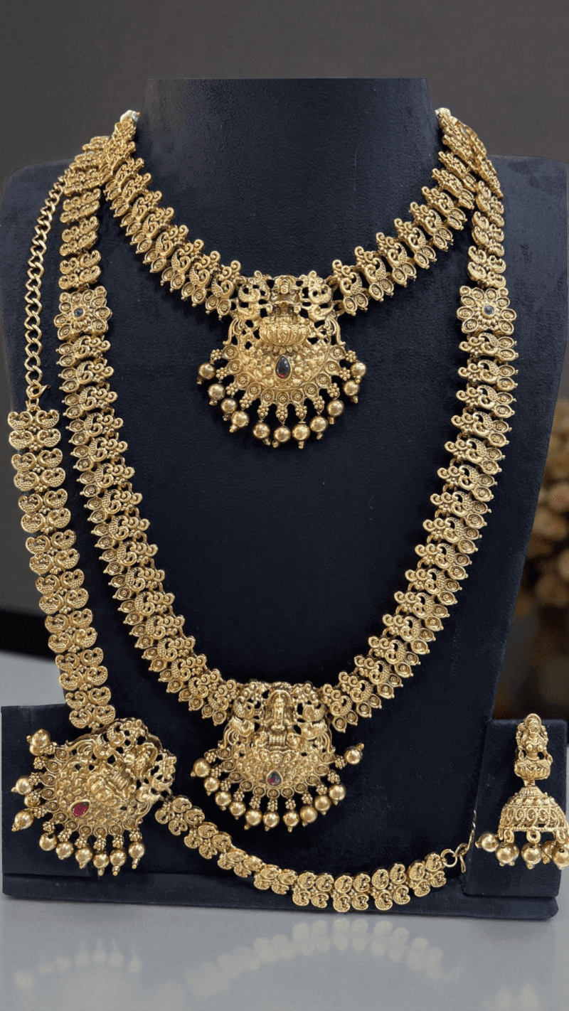 An elaborate traditional temple jewellery set, including a short neckpiece, long neckpiece, earrings, mang tika, and hip belt. Intricately designed to celebrate heritage craftsmanship, it’s perfect for weddings, special rituals, and grand celebrations.