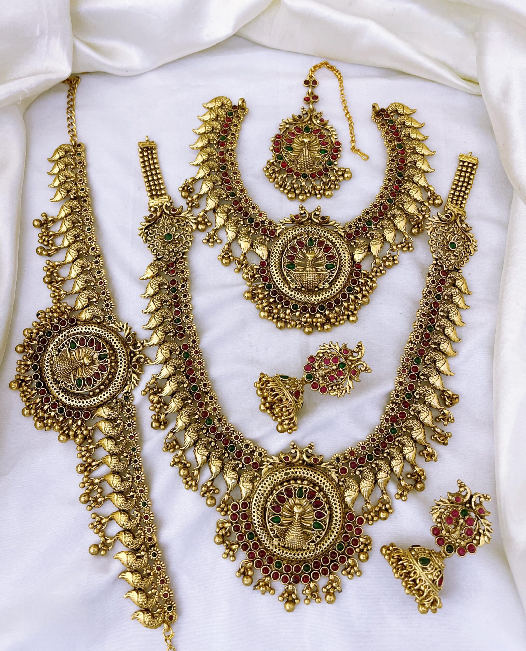 An elaborate traditional temple jewellery set, including a short neckpiece, long neckpiece, earrings, mang tika, and hip belt. Intricately designed to celebrate heritage craftsmanship, it’s perfect for weddings, special rituals, and grand celebrations.