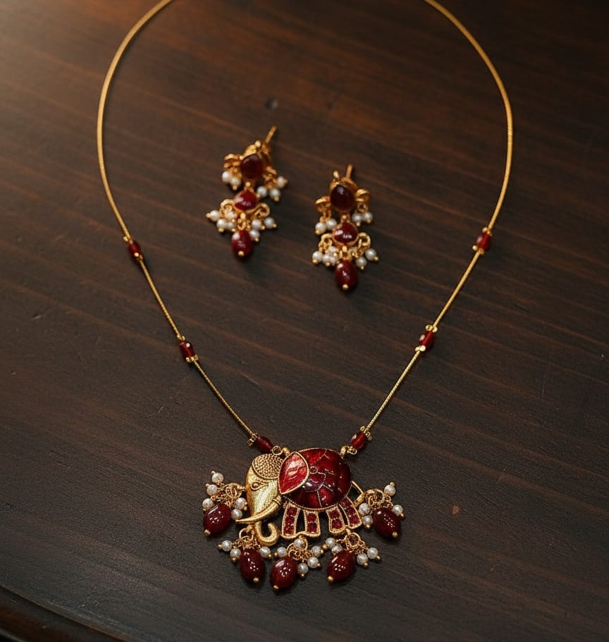 Elegant necklace set featuring a delicate chain with a statement pendant, highlighted by rich red tones and pearl detailing, paired with matching earrings for a graceful, festive look.