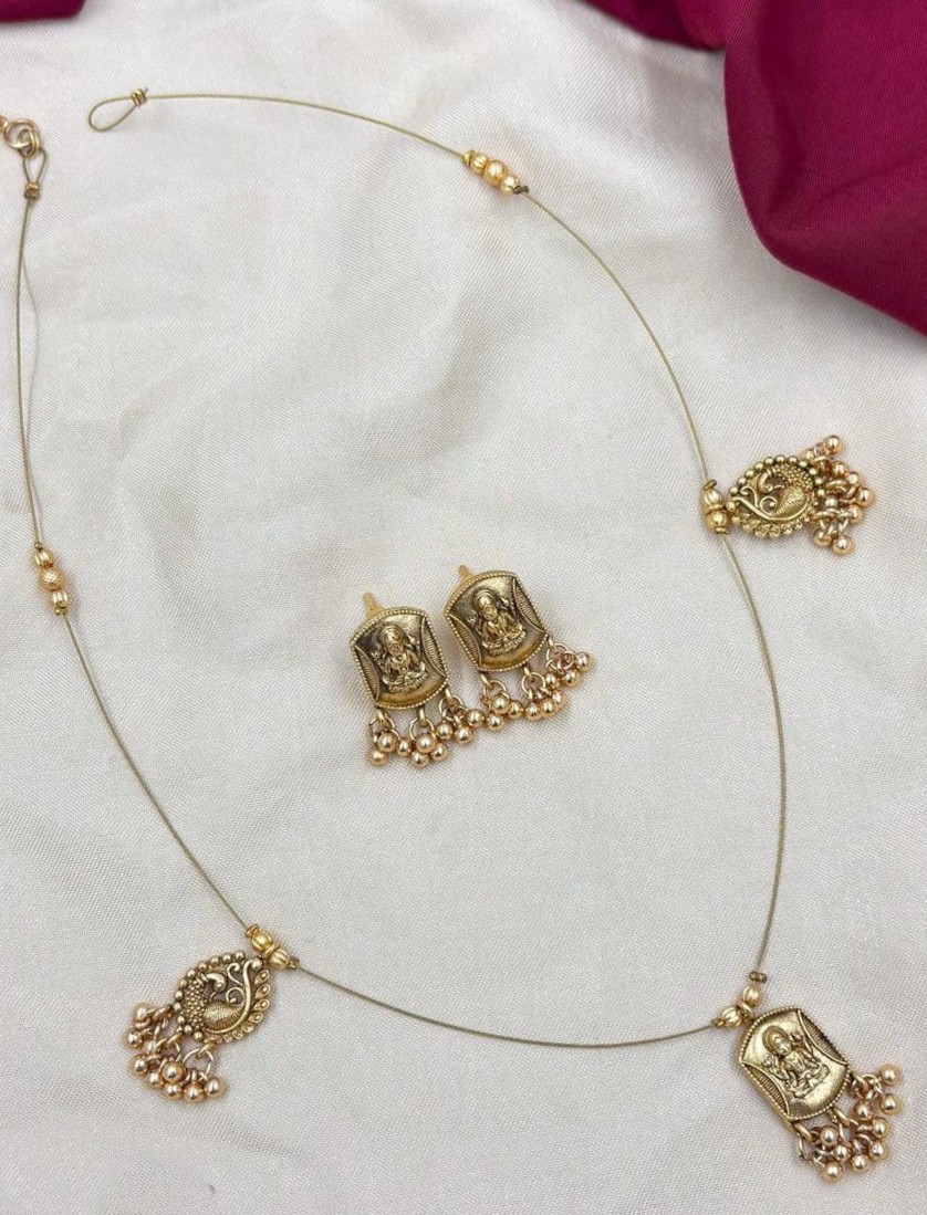 Finely crafted minimal temple jewellery set with antique finish and pearl hangings, paired with matching stud earrings.